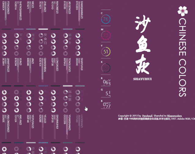和 Chinese Colors 頁面相似,依舊有三種顏色值表示方式,但提供的是日本傳統配色方案。
